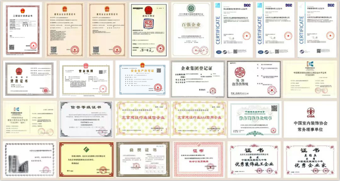 北京天文弘建筑裝飾集團有限公司,始創于1995年,正式成立于 2000年,注冊資本10800萬元??偛课挥诒本┦泻5韰^寶盛廣場。是建設部核準的國家建筑裝飾設計甲級資質、施工壹級資質的企業;同時具有建筑工程施工總承包貳級、市政公用工程施工總承包貳級、 建筑幕墻工程設計乙級、施工貳級、電子與智能化工程專業承包貳級、建筑機電安裝工程專業承包貳級、消防設施工程專業承包貳級、防水防腐保溫工程專業承包貳級、古建筑工程專業承包貳級、展覽陳列工程設計與施工一體化資質壹級、特種工程及鋼結構等多項資質。連續多年通過了ISO9001質量管理體系、ISO14001環境管理體系、ISO28001職業健康安全管理體系認證?,F為阿里巴巴經濟體優秀供應商、融創·中國戰略合作伙伴、中國建筑裝飾協會常務理事單位、北京市建筑裝飾協會副會長單位、中國建筑裝飾行業百強企業。是中央國家機關2011-2025年度工程項目定點施工企業。
